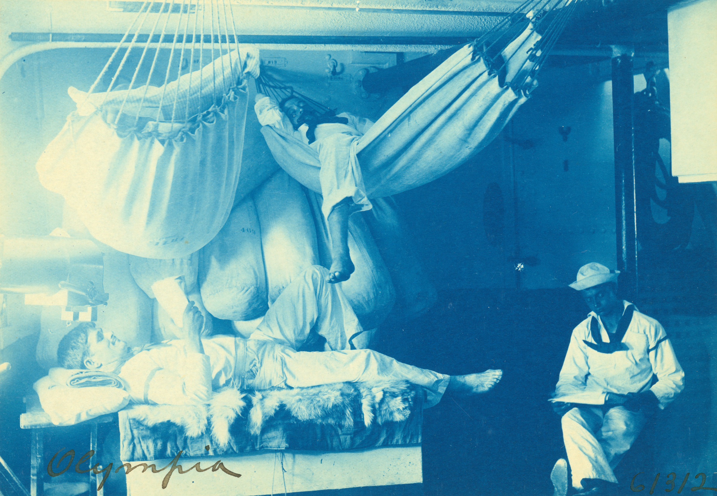 Sailors lounge on the berth deck of USS Olympia in 1898. Hooks for additional hammocks to be hung between those in use can be seen on the bulkhead behind. This image is a cyanotype, causing the distinctive color.