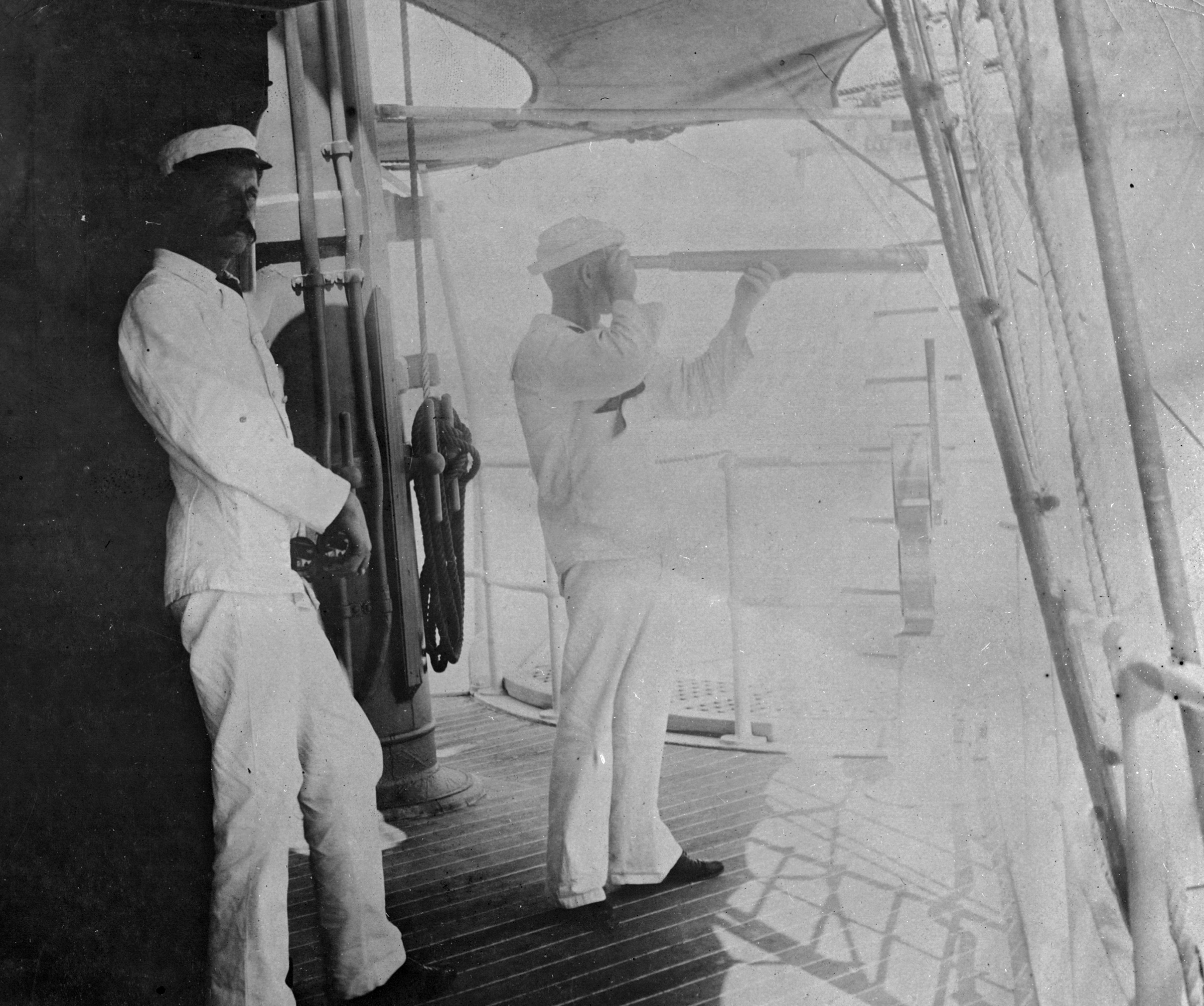 Sailors on board the protected cruiser USS Olympia stand watch. Shown is Quartermaster R.C. Mehrtens, who steered the Olympia during the famous Battle of Manila Bay.