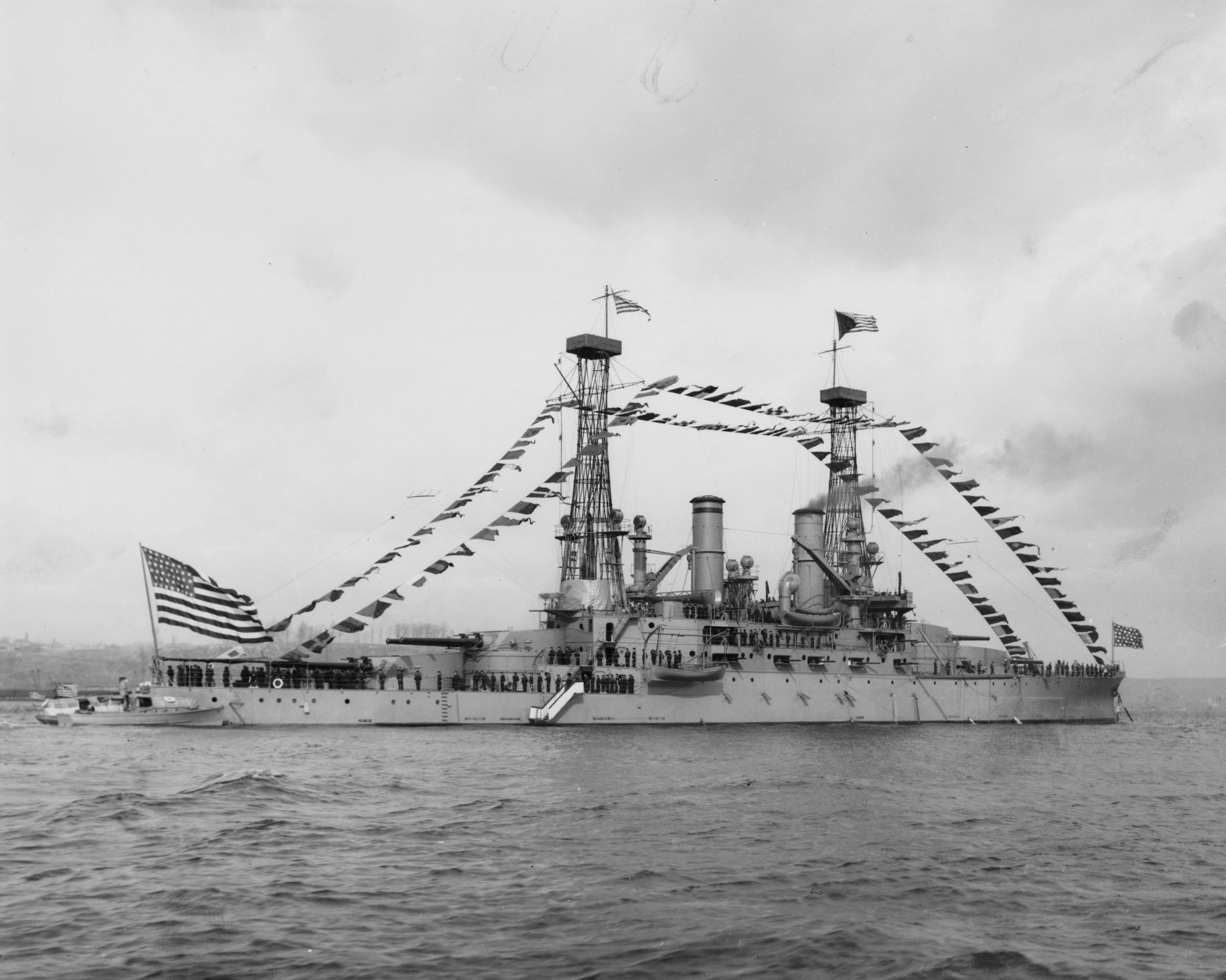 The battleship USS Michigan, dressed with flags, and with her crew manning the rails, seen during the New York Naval Review in 1911.