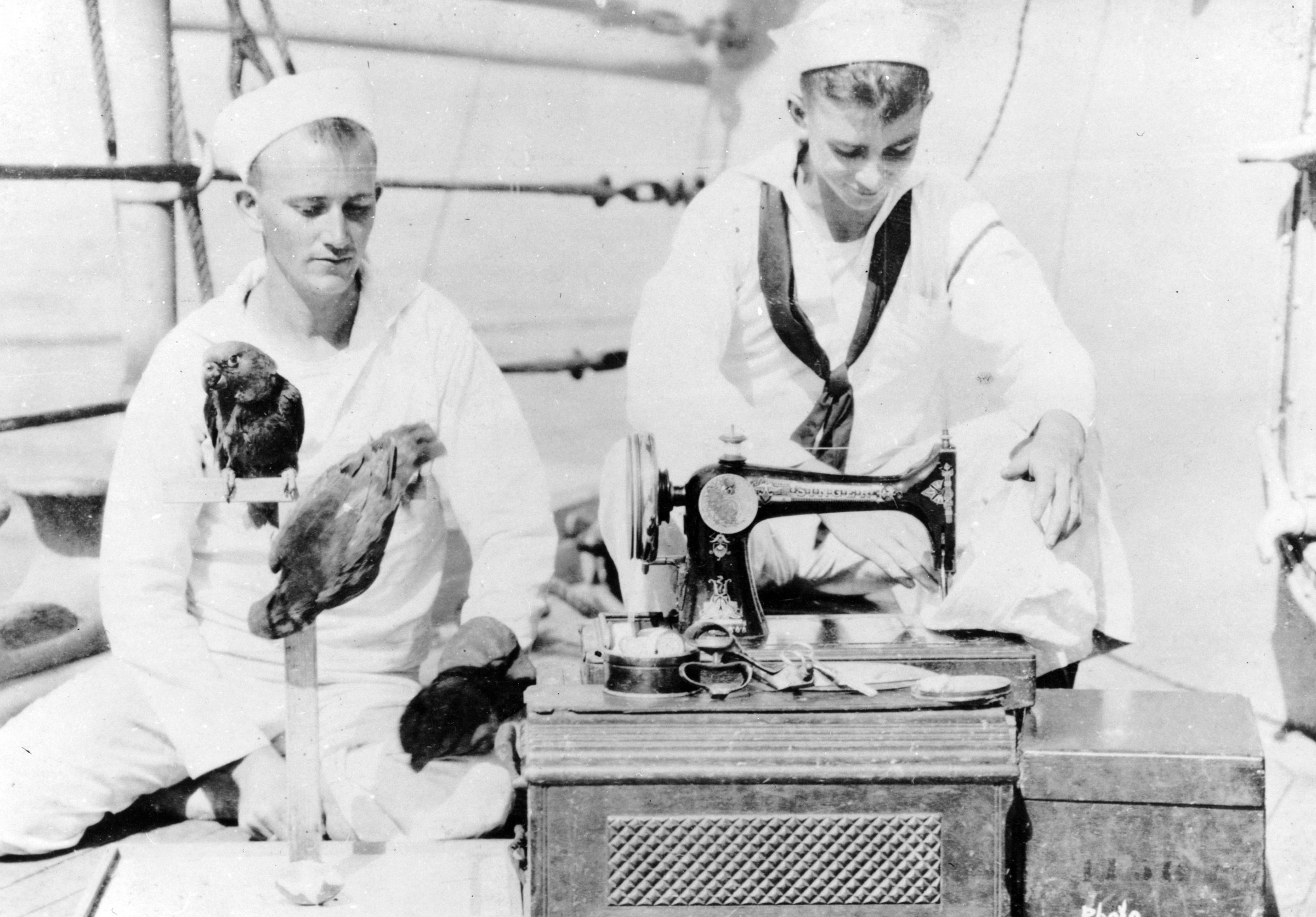 Two sailors modify the appearance of a hat, while pet parrots watch from a perch.
