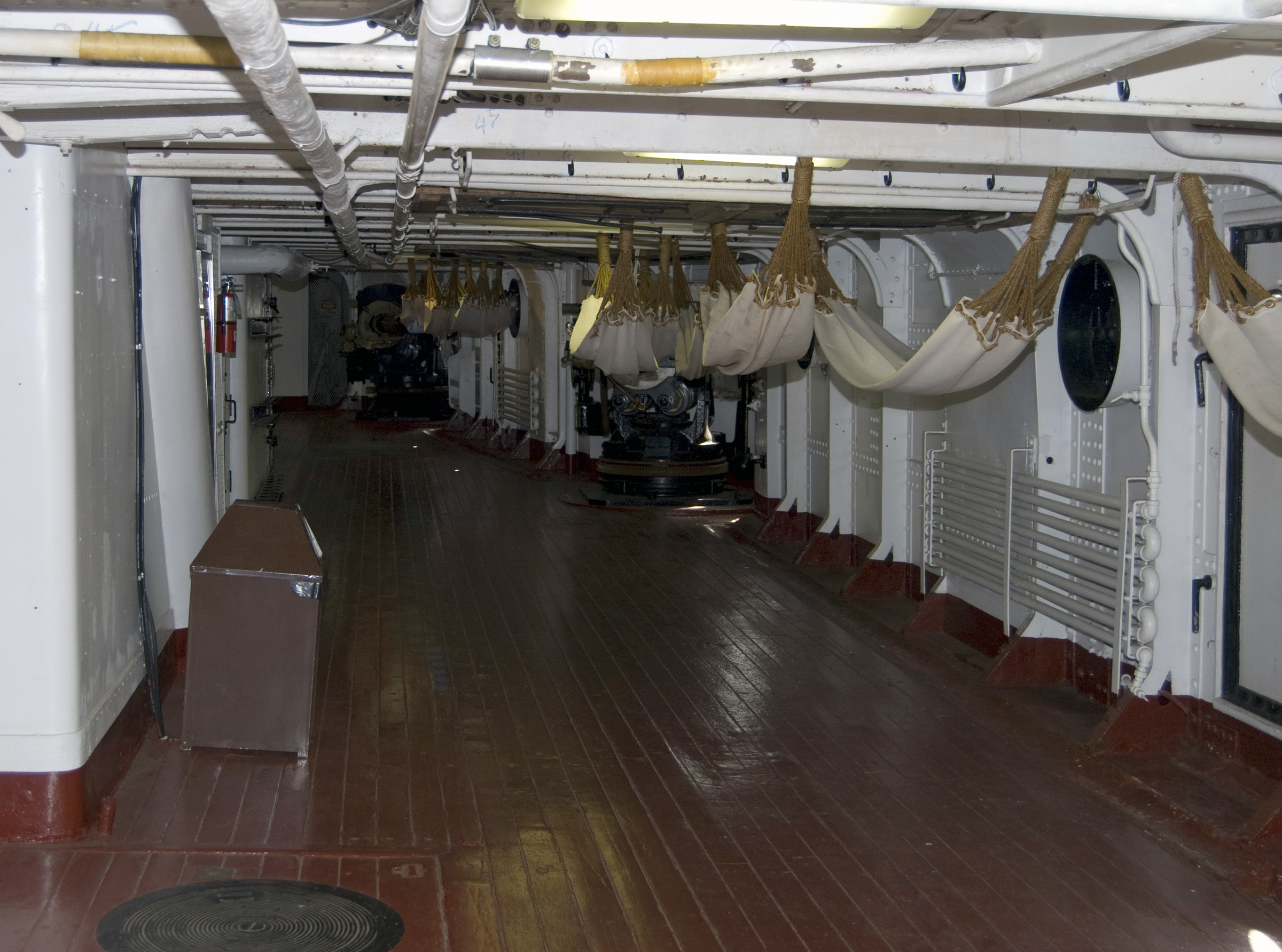 This 2010 photo shows the berth deck of the museum ship USS Olympia, with numerous hammocks slung from the overhead.