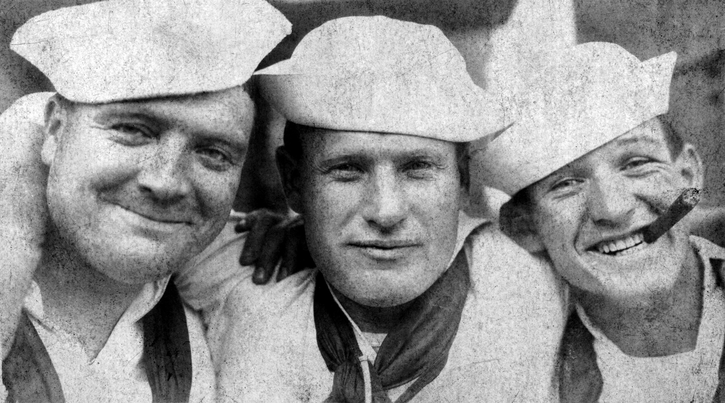 Three sailors mug for a photo, circa 1908.
