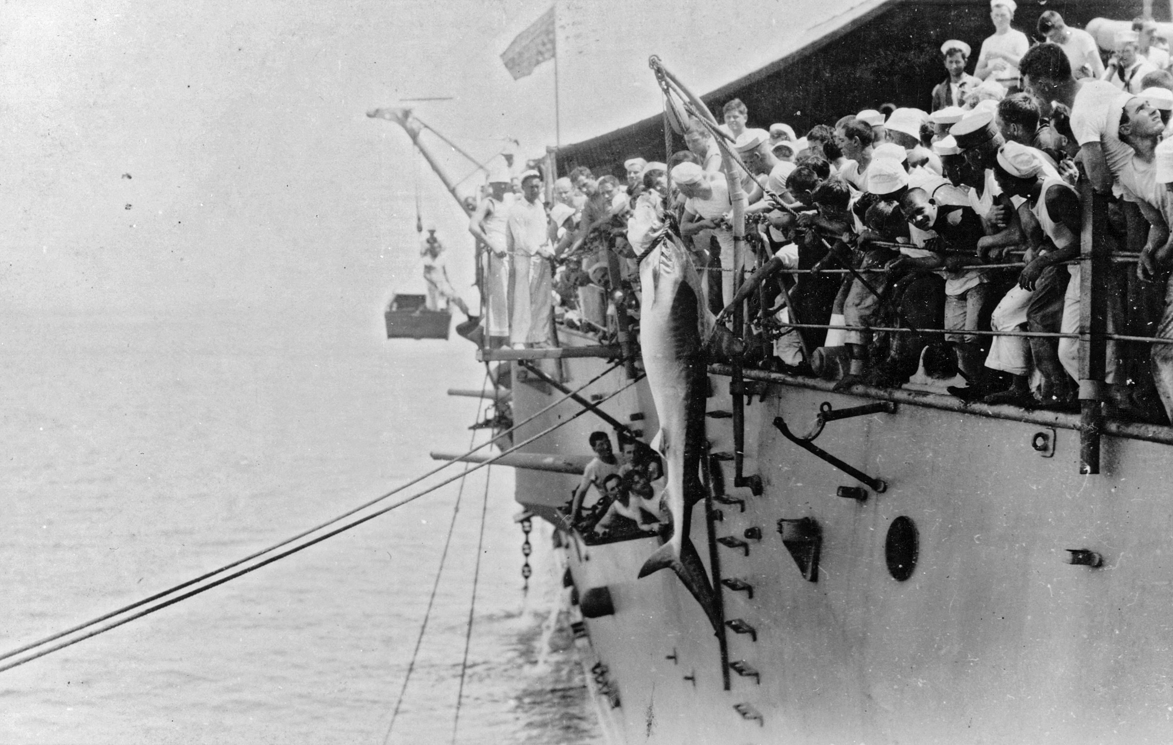 Sailors on board the cruiser Maryland haul a shark on board, circa 1912.