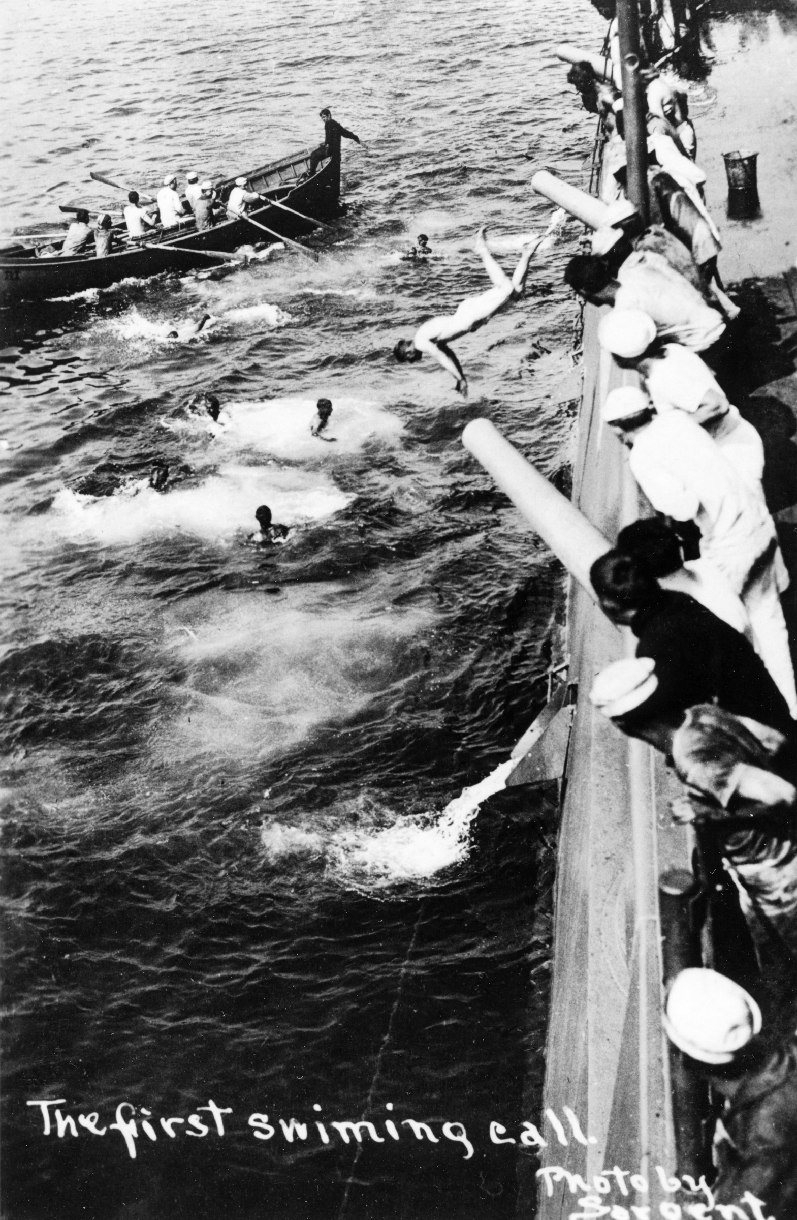 Sailors leap off the side of the battleship USS Rhode Island after coaling ship, circa 1913.