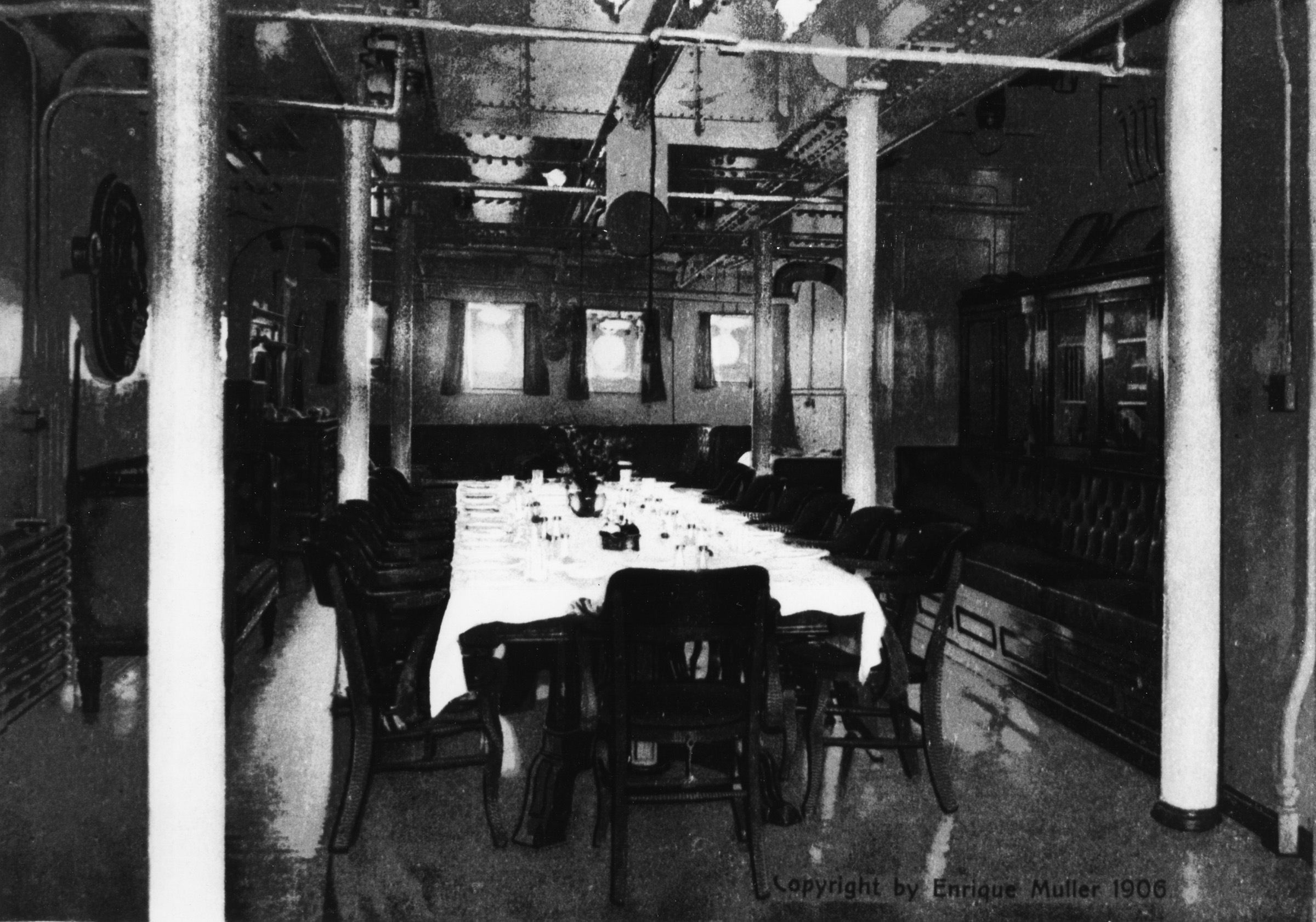 The neatly set dining table in the Officers' Mess Room sits ready for a meal on board the cruiser USS Pennsylvania in 1906. This is a black and white print of a color-tinted postcard.