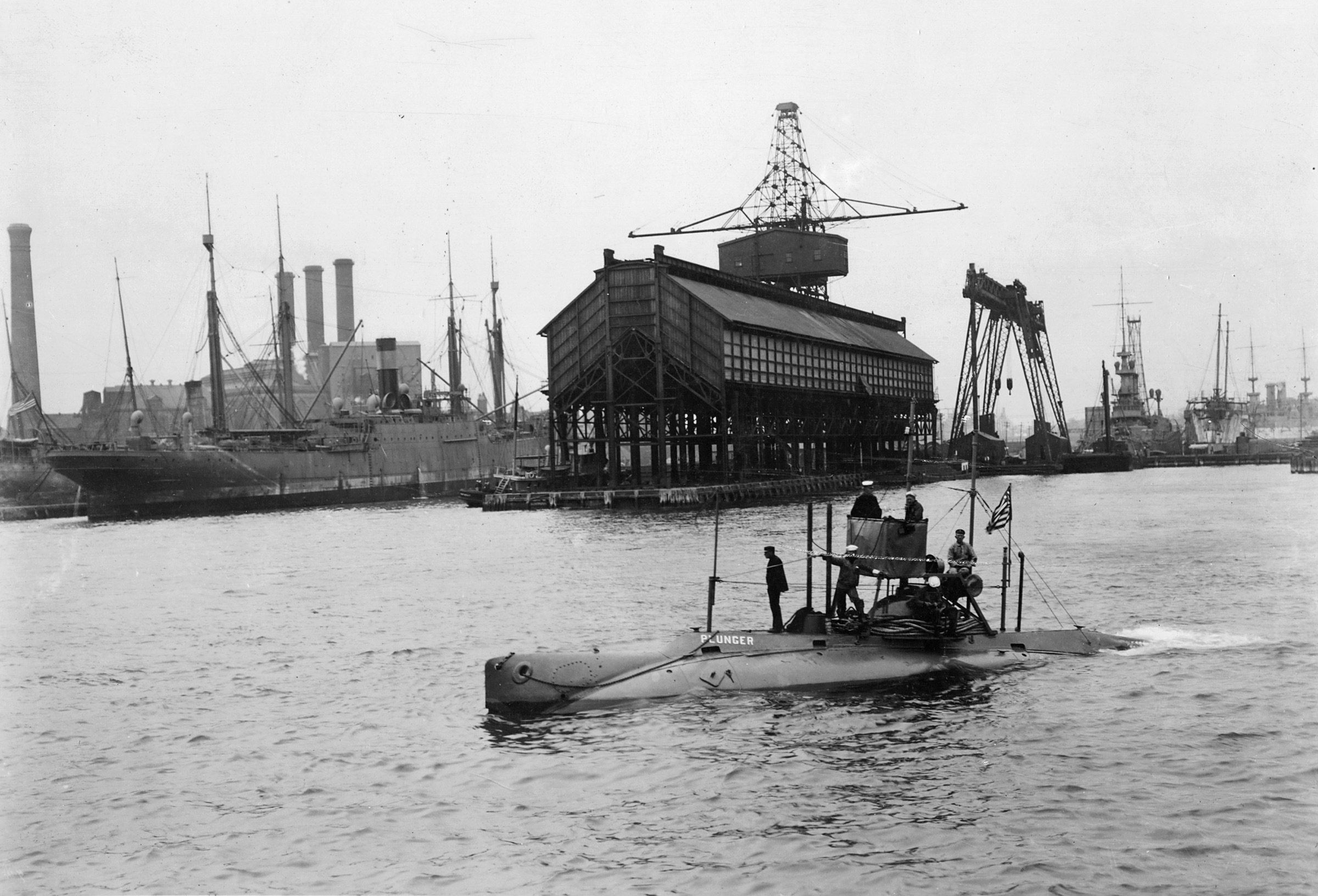 The submarine USS Plunger underway off Brooklyn Navy Yard in 1909.