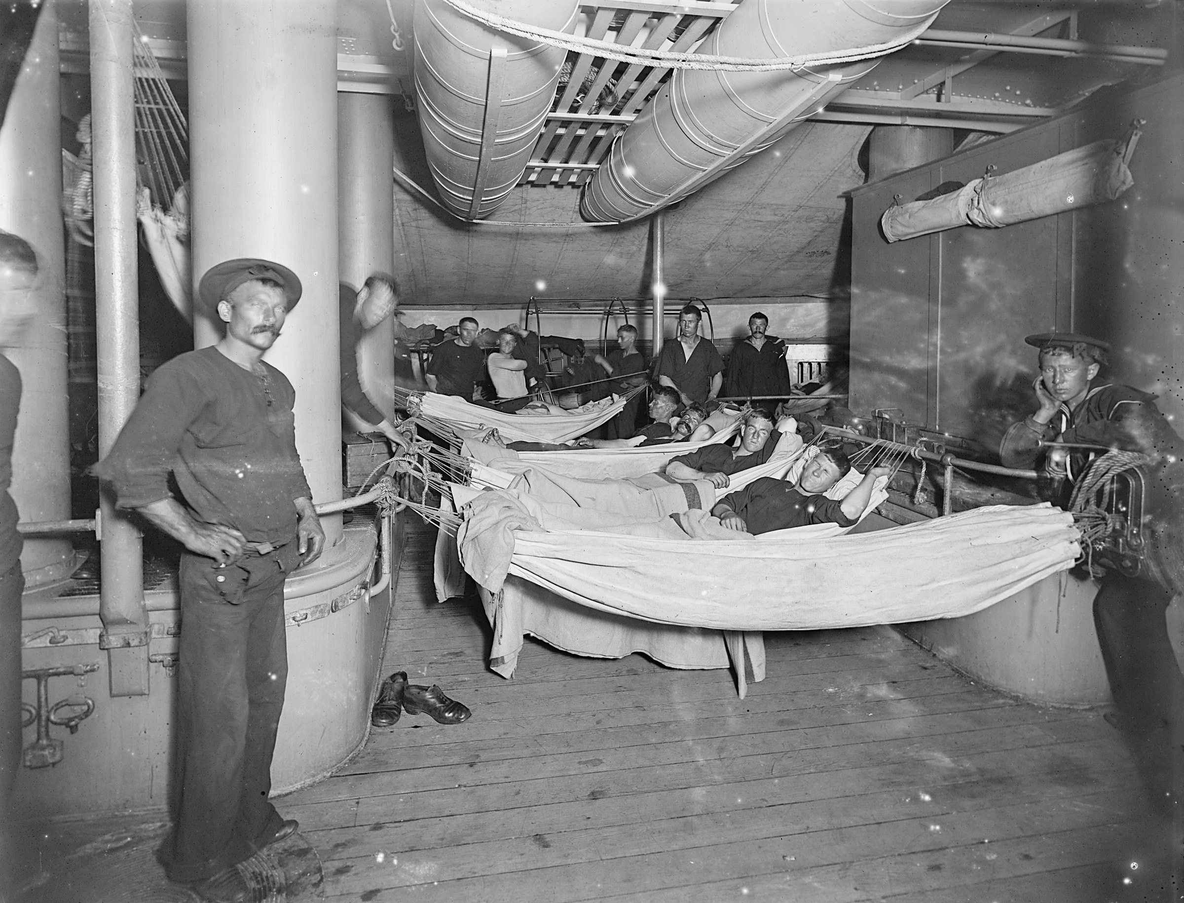 This photo on deck of the cruiser USS Brooklyn shows a number of hammocks slung in a temporary arrangement, possibly to escape the heat below decks.