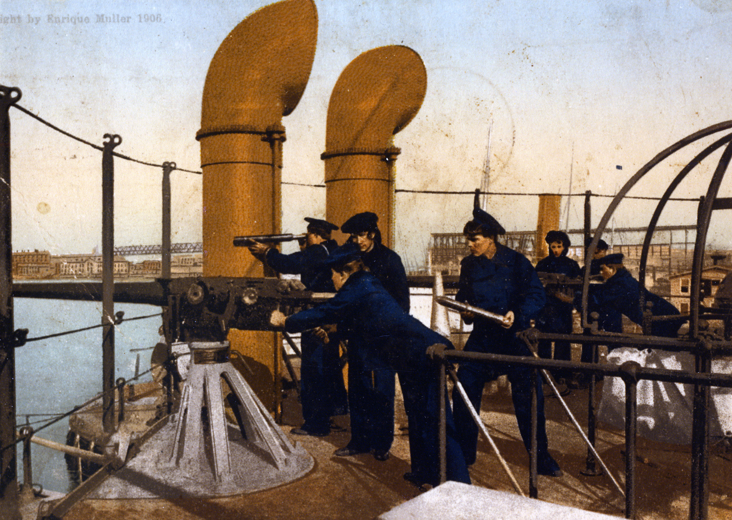 Sailors practice gunnery on board a Navy warship, in a colorized postcard.