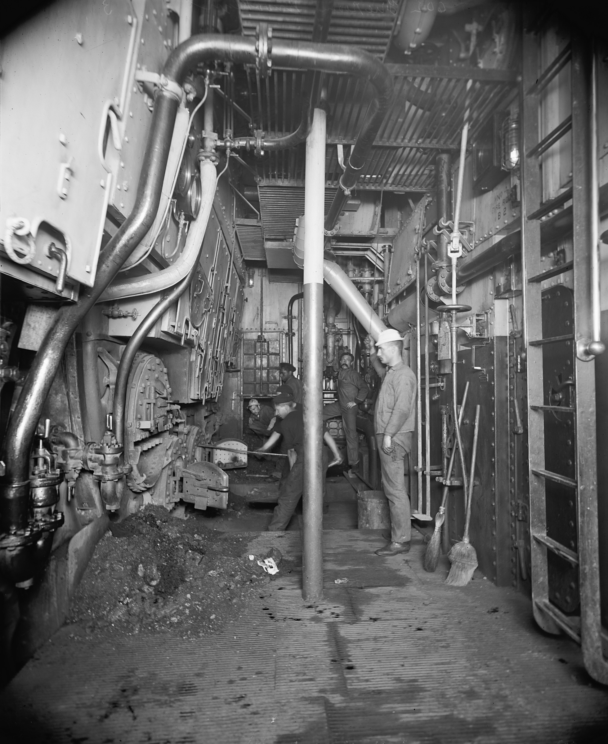 Sailors stoke boilers in the fire room of the cruiser USS Brooklyn.