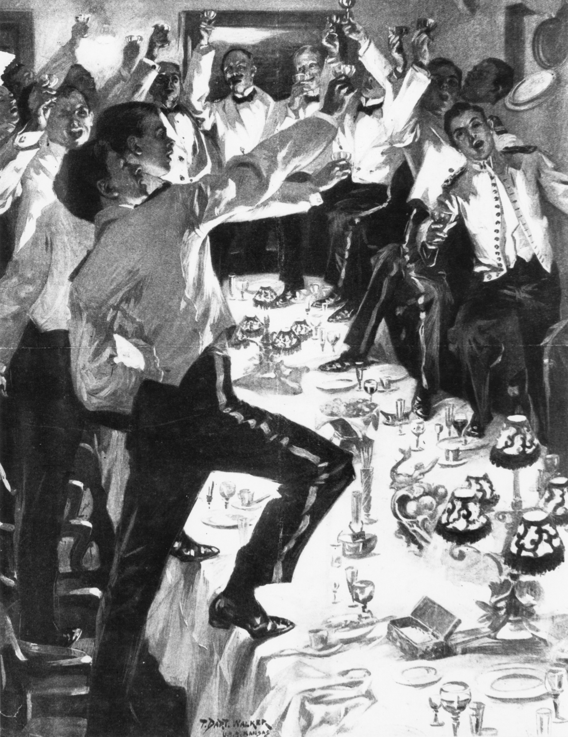 A drawing depicting a Christmas Eve toast on board the battleship USS Kansas in 1908, during the cruise of the Great White Fleet.