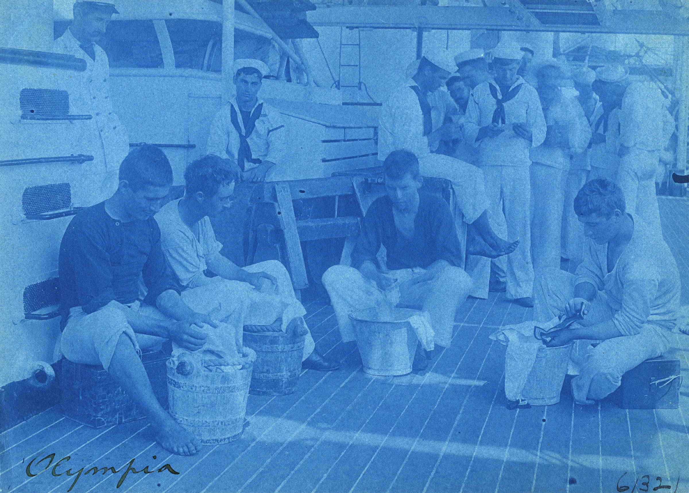 Cyanotype print of sailors doing their laundry in buckets on board USS Olympia, 1898.