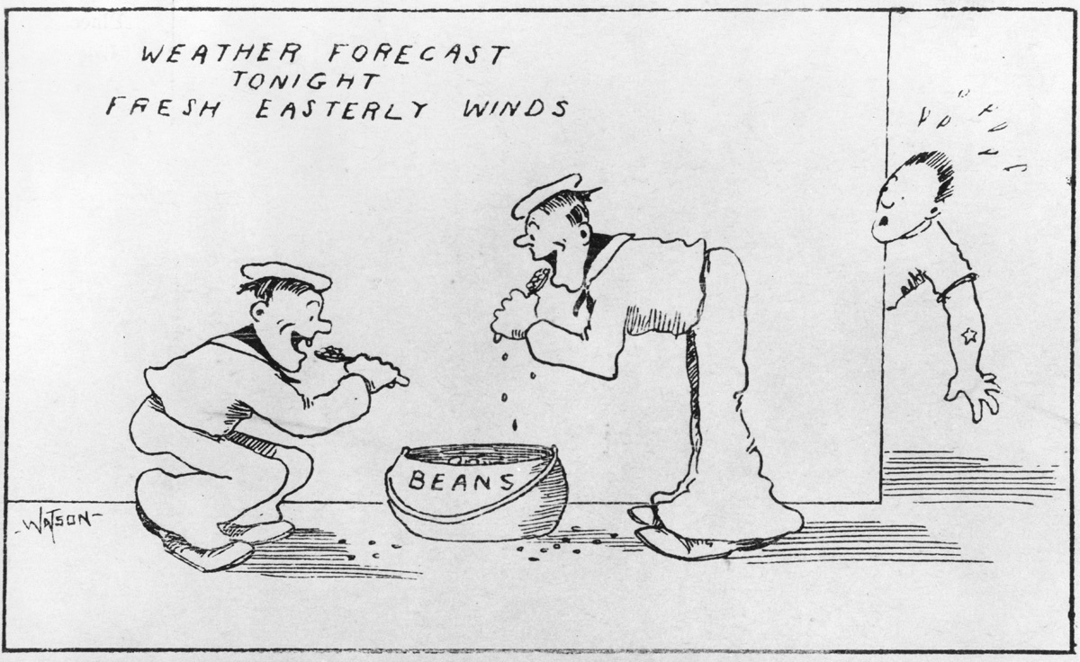 This pre-WWI cartoon postcard depicts a certain problem with a heavy diet of beans in the Navy.
