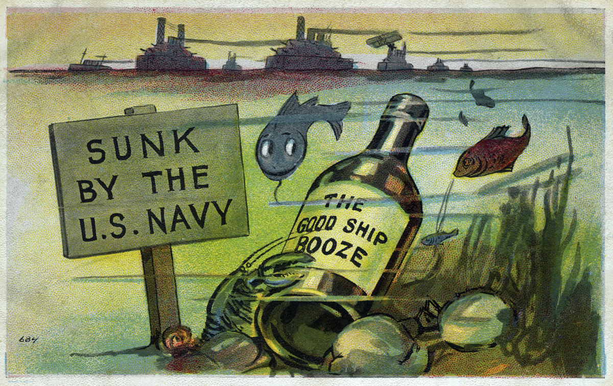 This postcard cartoon comments on the Navy's elimination of alcohol in 1914, prior to national Prohibition.