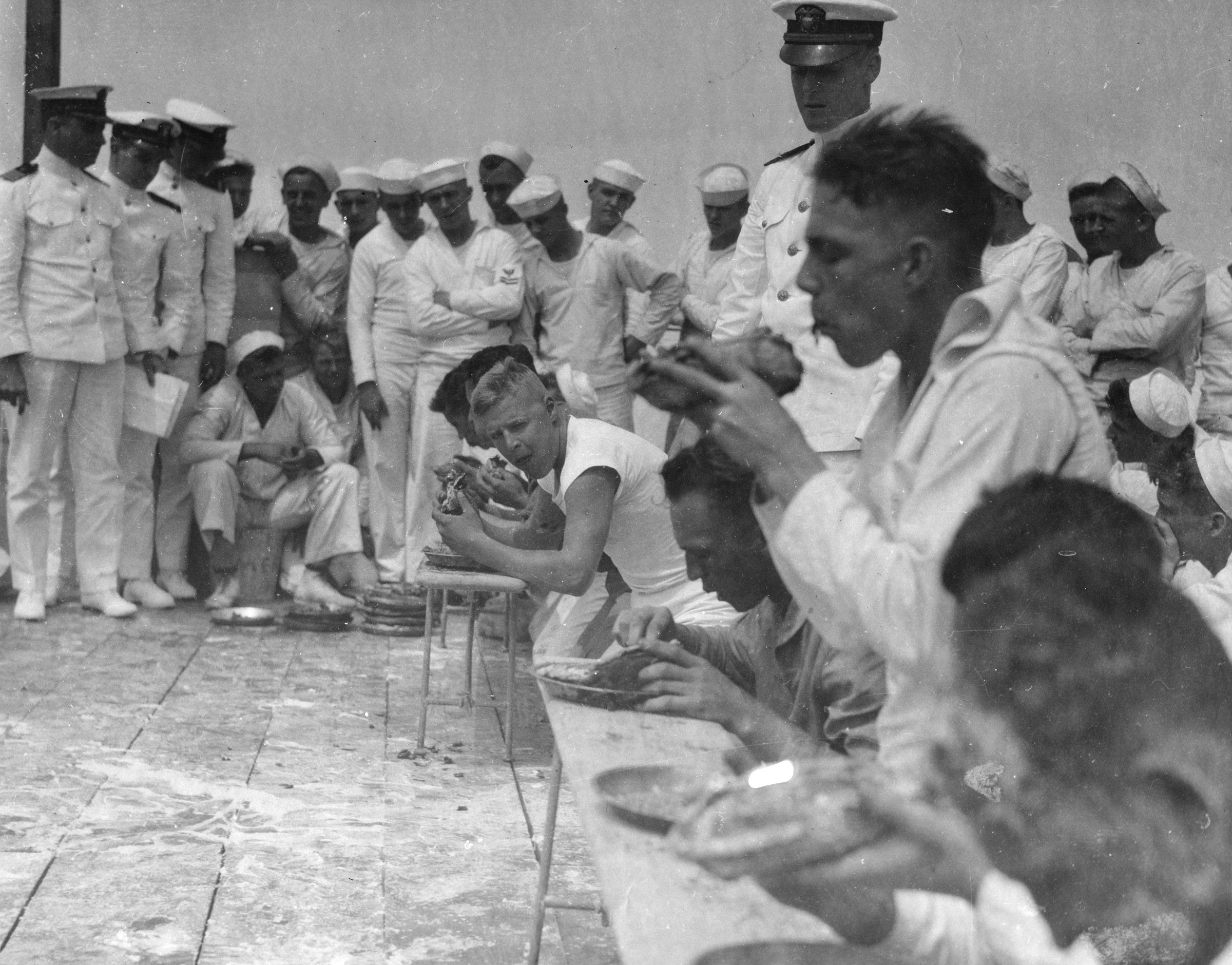 Sailors on board the battleship USS Maryland engage in a pie-eating contest.