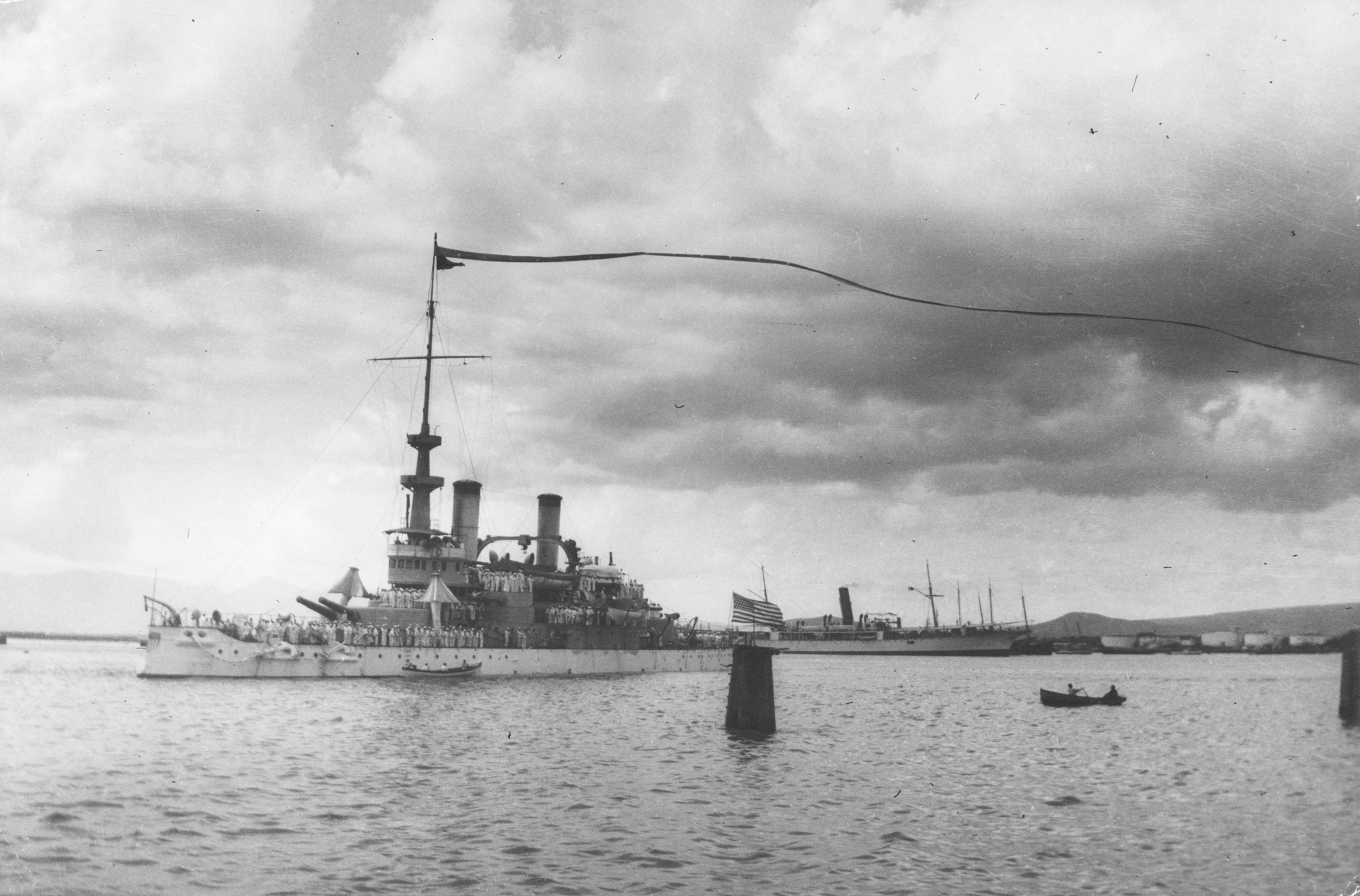 The battleship USS Oregon (BB-3) departs Honolulu for San Francisco in 1905. The long pennant flying from her mast signifies a ship returning home after an extended deployment overseas.
