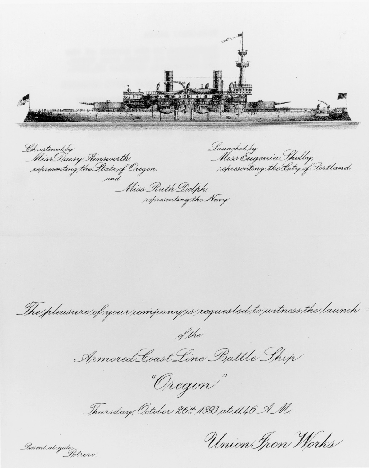 An invitation to the launching of the battleship USS Oregon in 1893, at Union Iron Works in San Francisco.