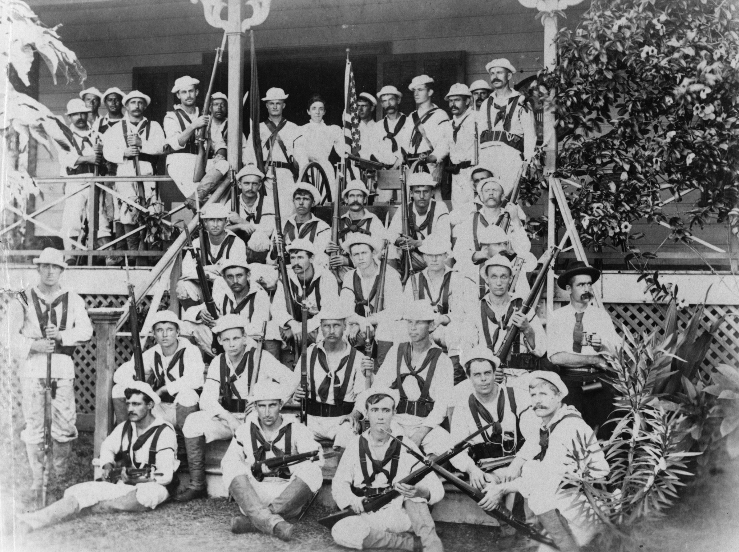 Armed sailors from the cruiser USS Philadelphia pose at the American consulate at Apia, Samoa in April 1899.