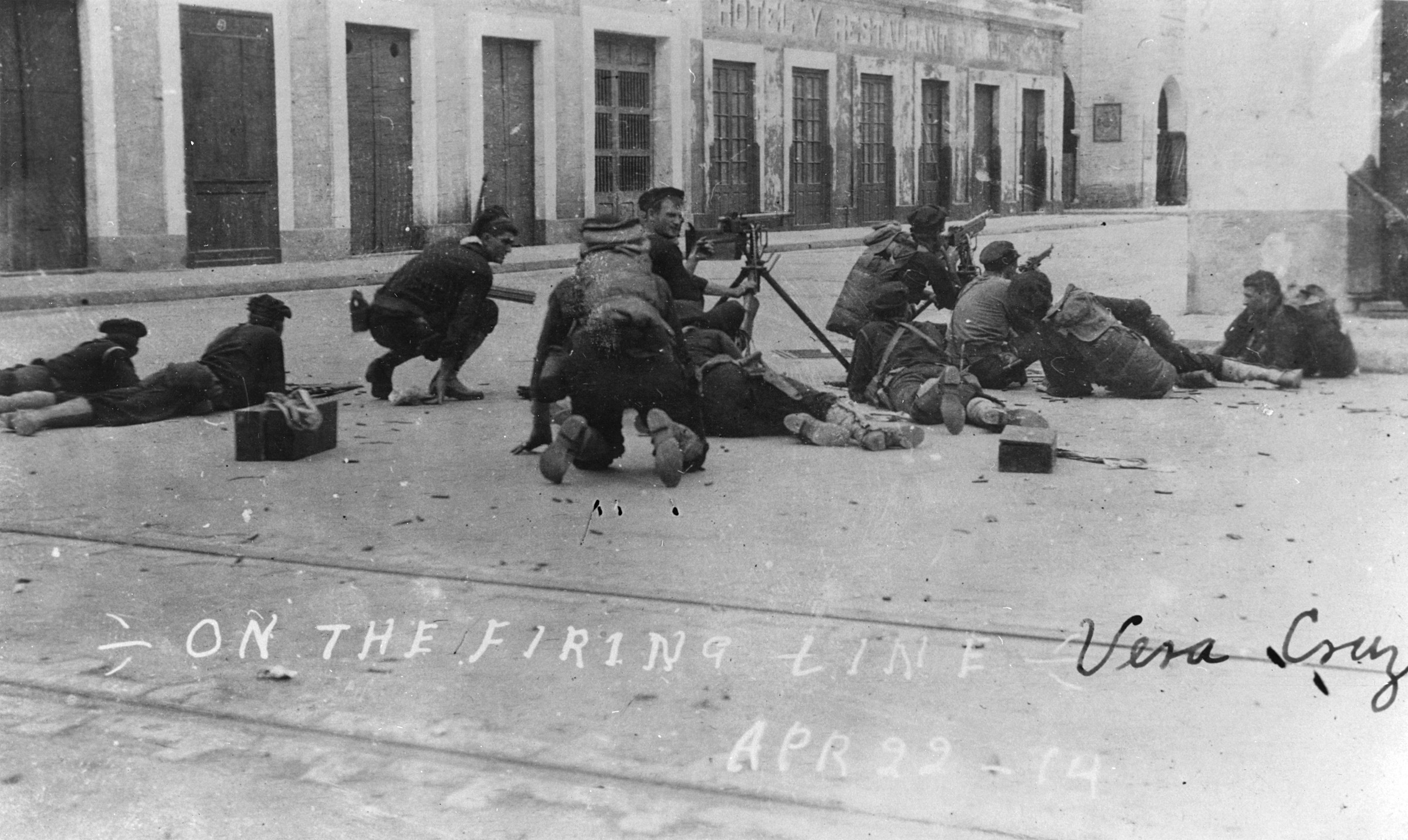 Sailors armed with rifles and machine guns hold down precarious positions in the middle of Avenue Independencia in Vera Cruz, 1914.