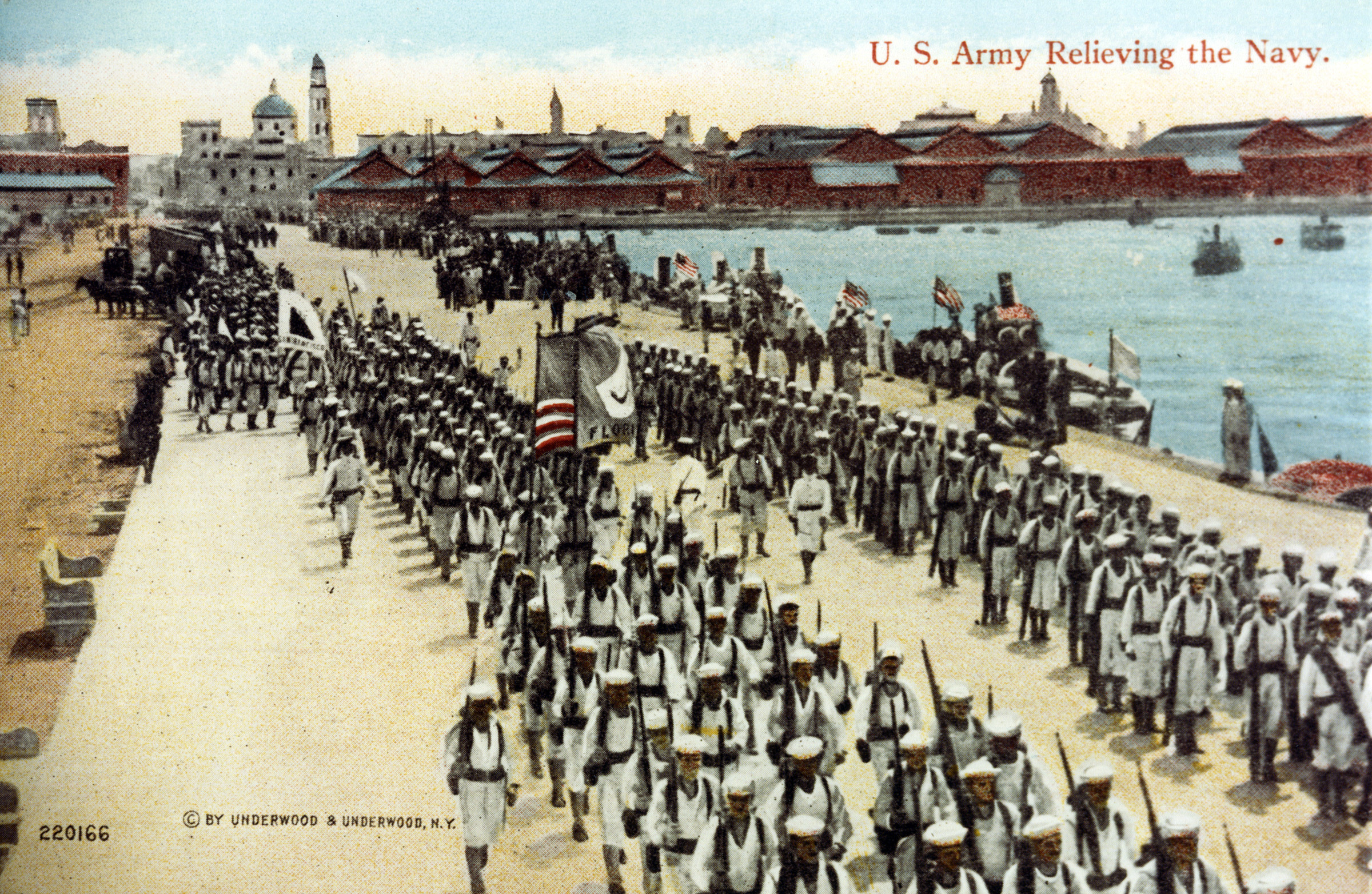 With Vera Cruz safely in American hands, sailors march along the waterfront in May 1914, giving way to Army troops. Colorized postcard.