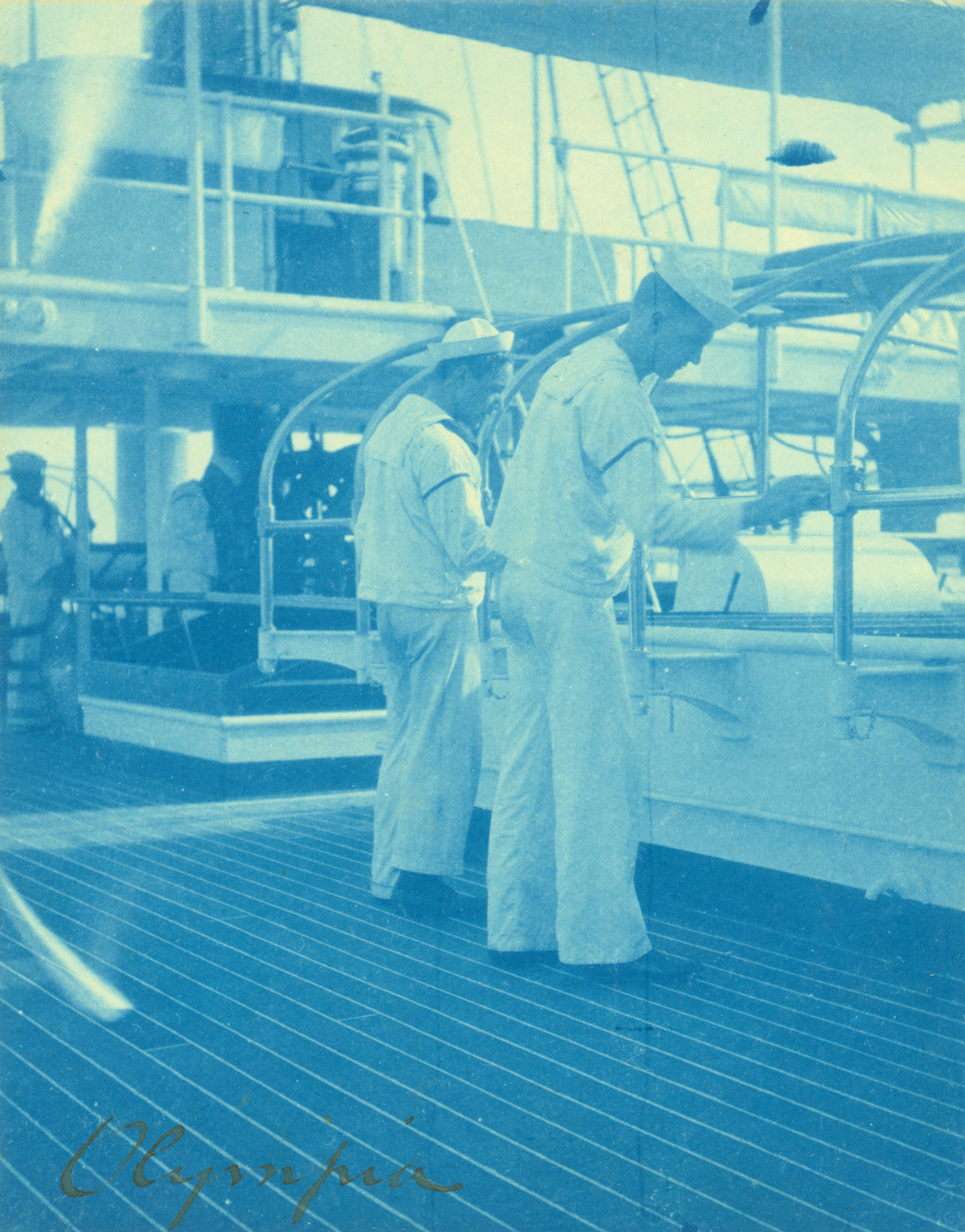 Sailors on board USS Olympia shine metal surfaces on deck, 1898.